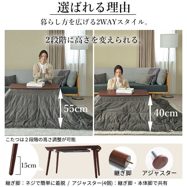 こたつセット こたつテーブル 掛 け布団 長方形 105x55cm 2way 高 さ調節 継ぎ脚 おしゃれ 省エネ フラットヒーター ソファで使え る コタツ 北欧