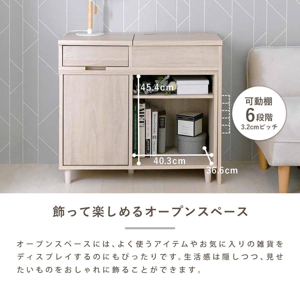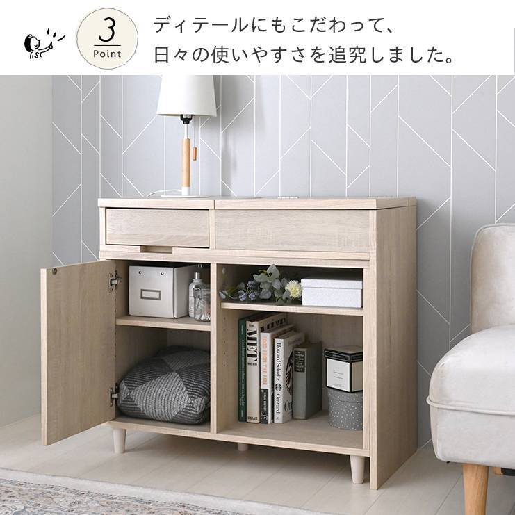 引き出し収納、扉付き収納、オープン棚を備え、