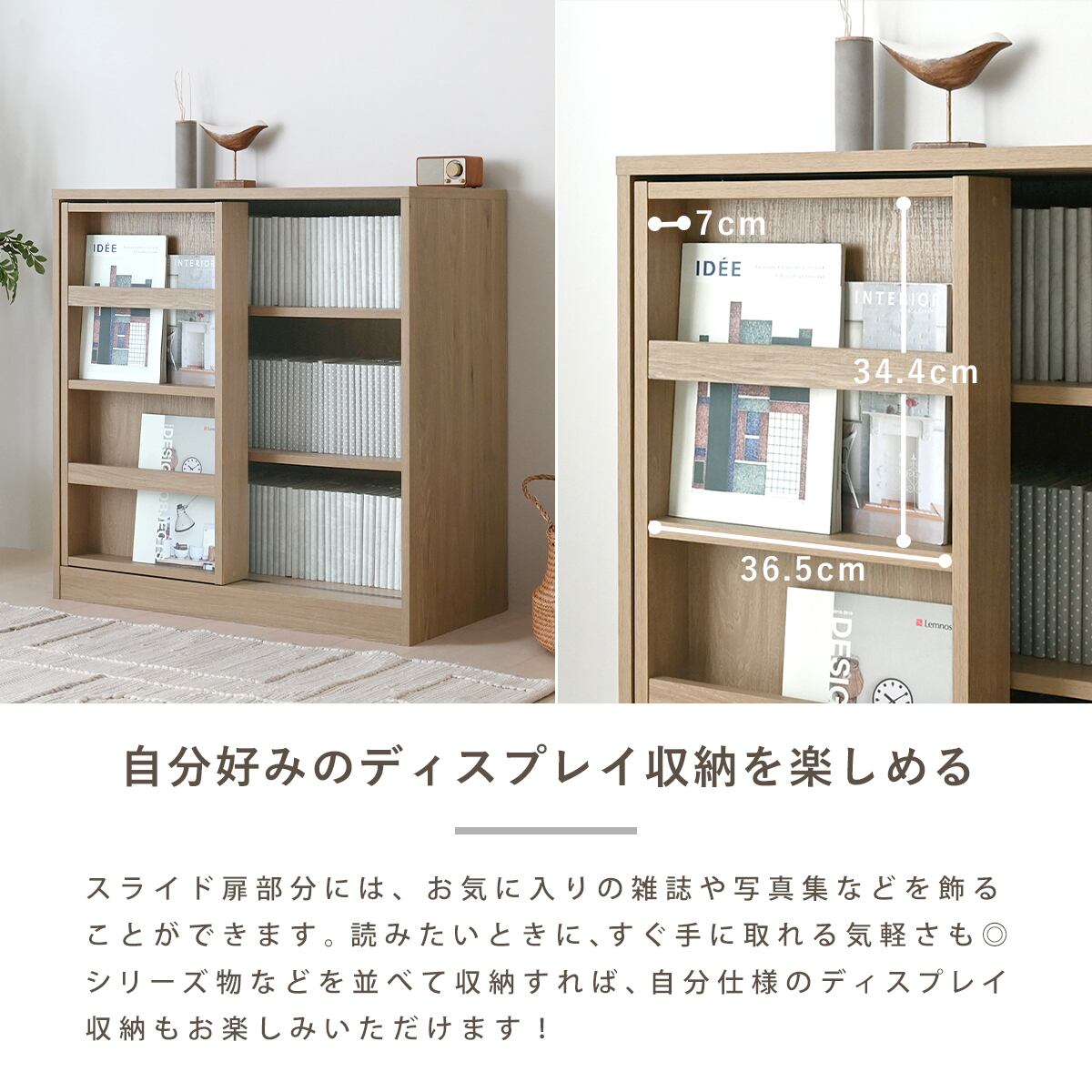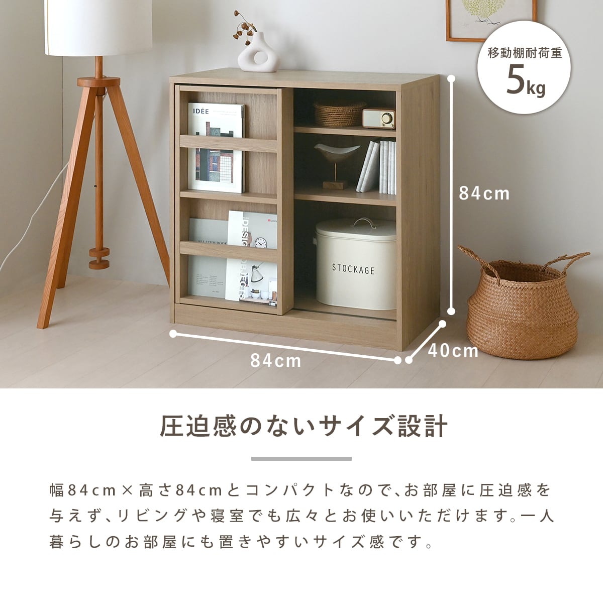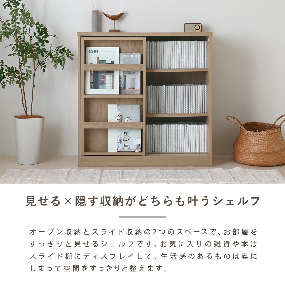 収納力とデザイン性を両立した、スライド式ブックシェルフ(幅84cm)。