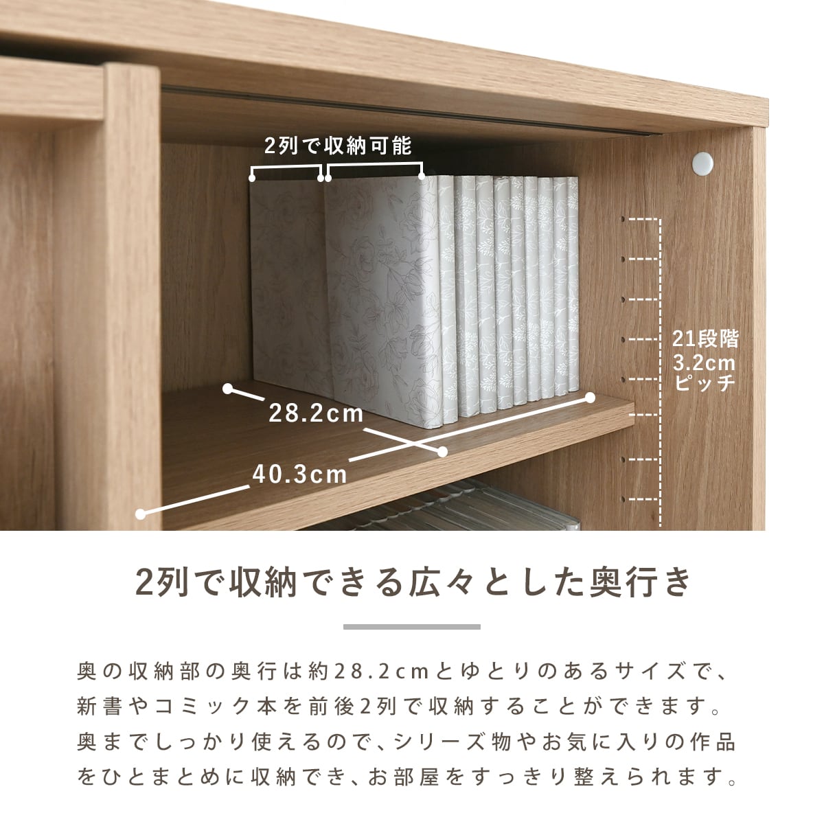 マンガや文庫本を前後2列で収納可能。