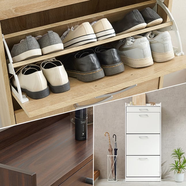 引出し付きで靴のお手入れ道具や玄関小物を収納可能です。