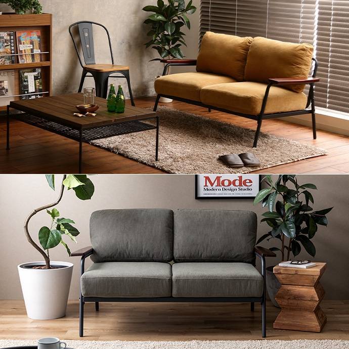 コーデュロイの柔らかな質感に、スチールと天然木を組み合わせた2人掛けソファ。