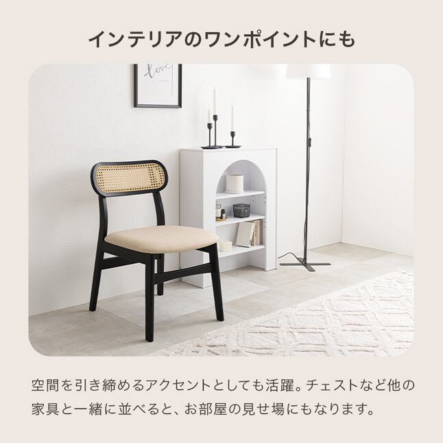 背もたれのラタン調かごめ編みが特徴的な、可愛いデザインのダイニングチェア。