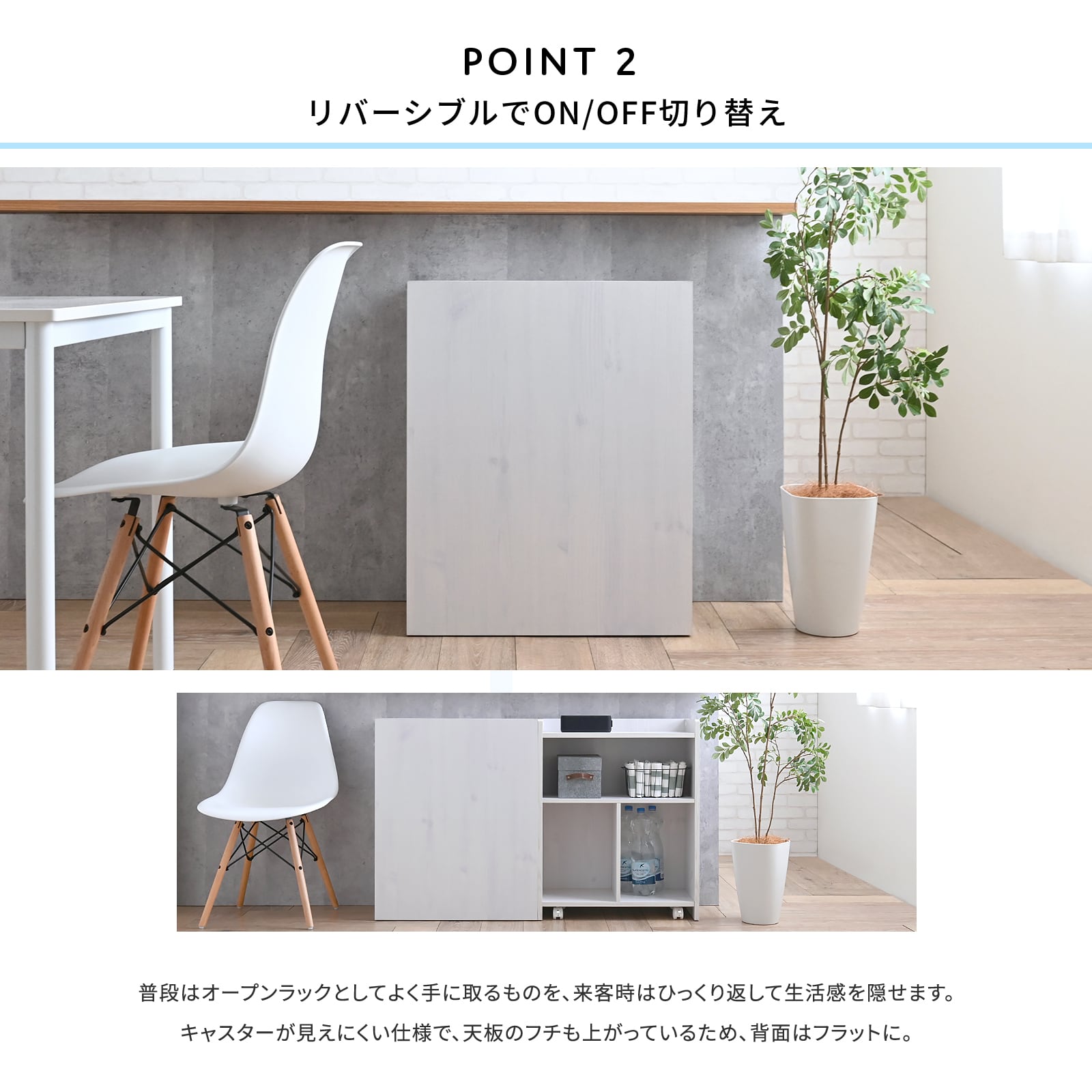 【POINT2*オープン部を壁付けて、生活感を隠せるリバーシブル仕様】